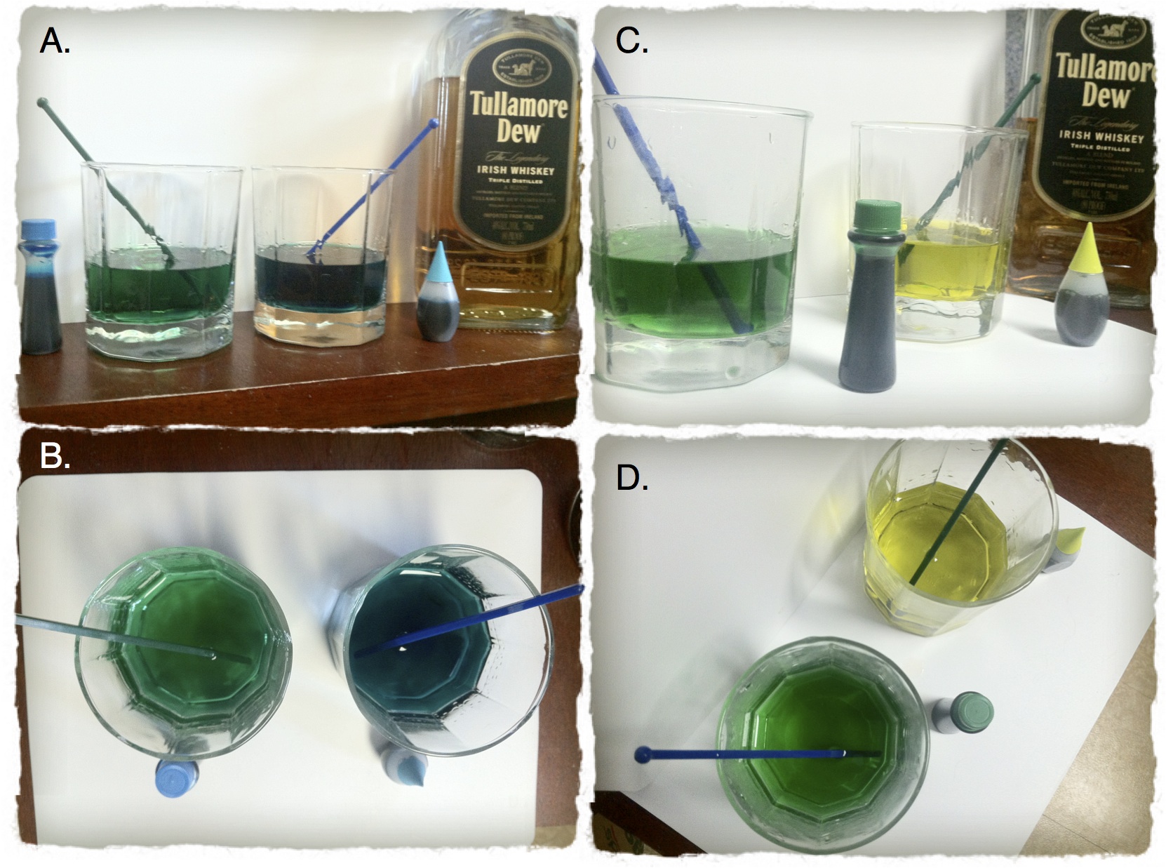- place one drop of the food coloring to be tested each tumbler, this may take more than one round; drink responsibly! (& see Surprise Result below!)