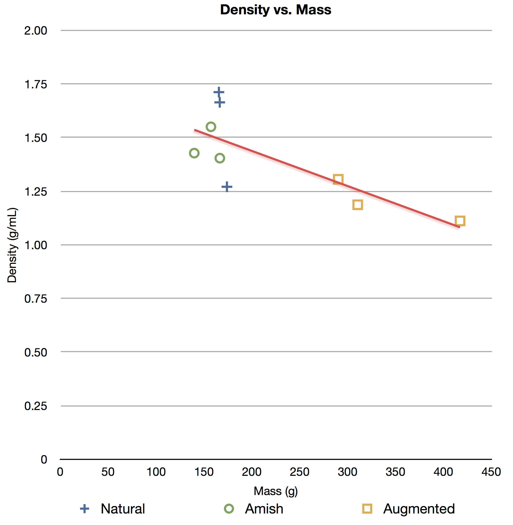 Breast Density Graph Published March 31, 2013 at 2003 × 2050 in Breast Size Measurement via Archimedes’ Principle ← Previous Next → Breast density vs. breast mass. Plot of breast density versus breast mass for all three types of measured breasts. A linear regression line (red) is shown indicating the overall trend across all three types.