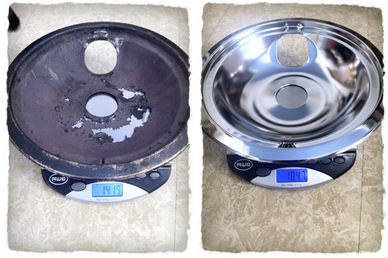 Comparison of the old and new pans. While we don’t know the actually mass of the old pan when it was new, there is a significant difference, and the amount of rust under the old pan makes a ~43g difference seem believable.