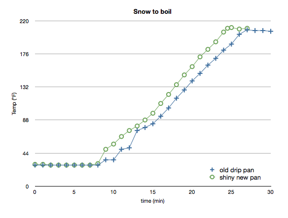 Plots of temperature over time from “snow-to-boil” for an old/rusty drip pan and a shiny new drip pan.