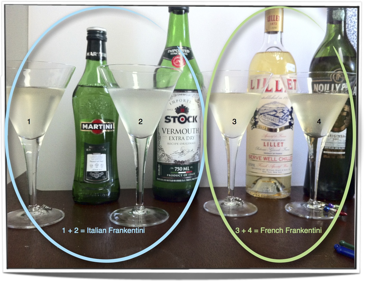 - 4 wet martinis, divided into pairs made with similar-styled vermouths (2 Italian, 2 French)