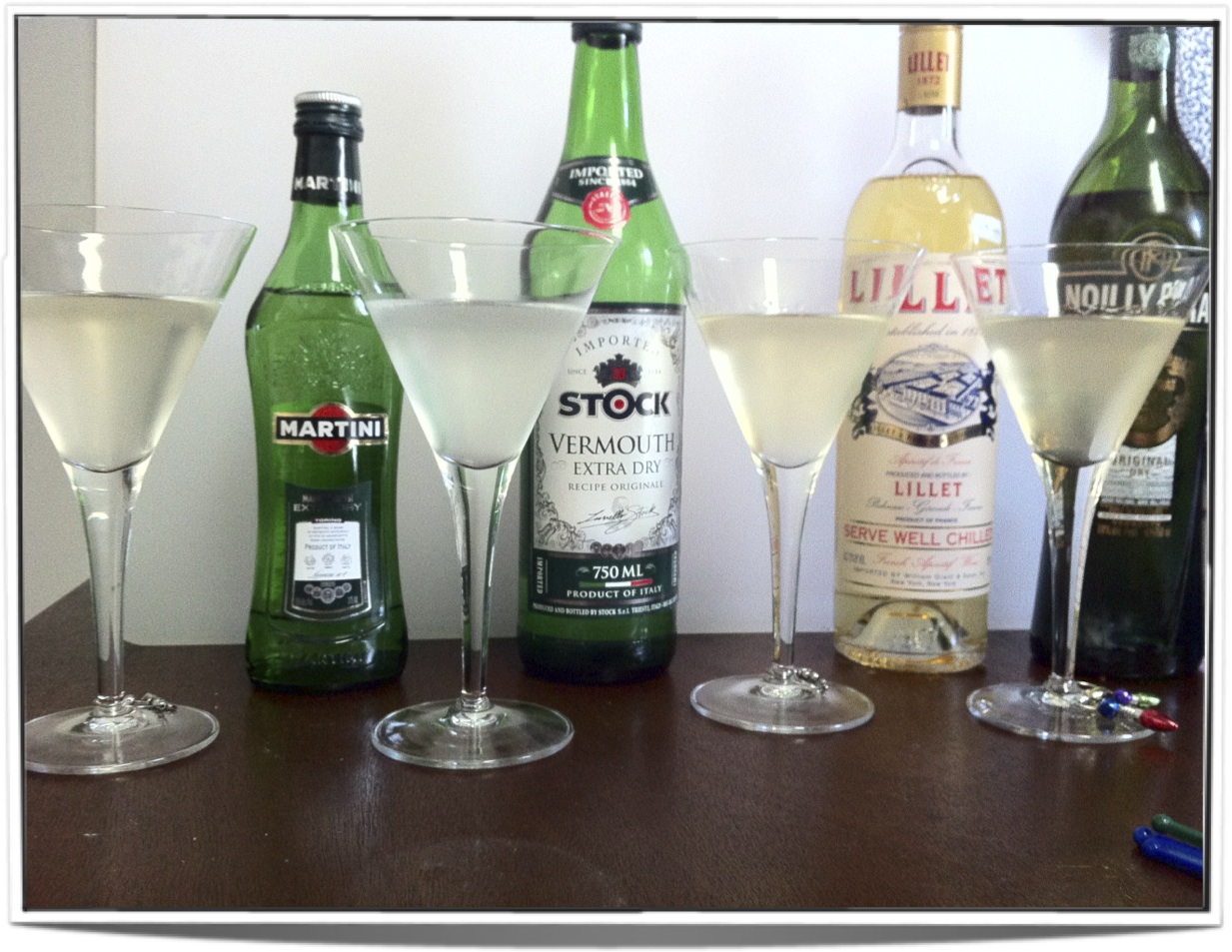 Martinis made with different vermouths. Each martini was made with the vermouth to its right in the photo.