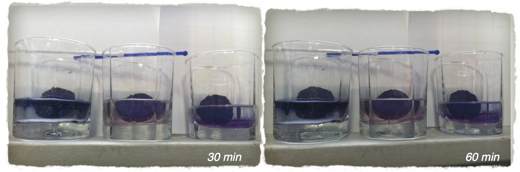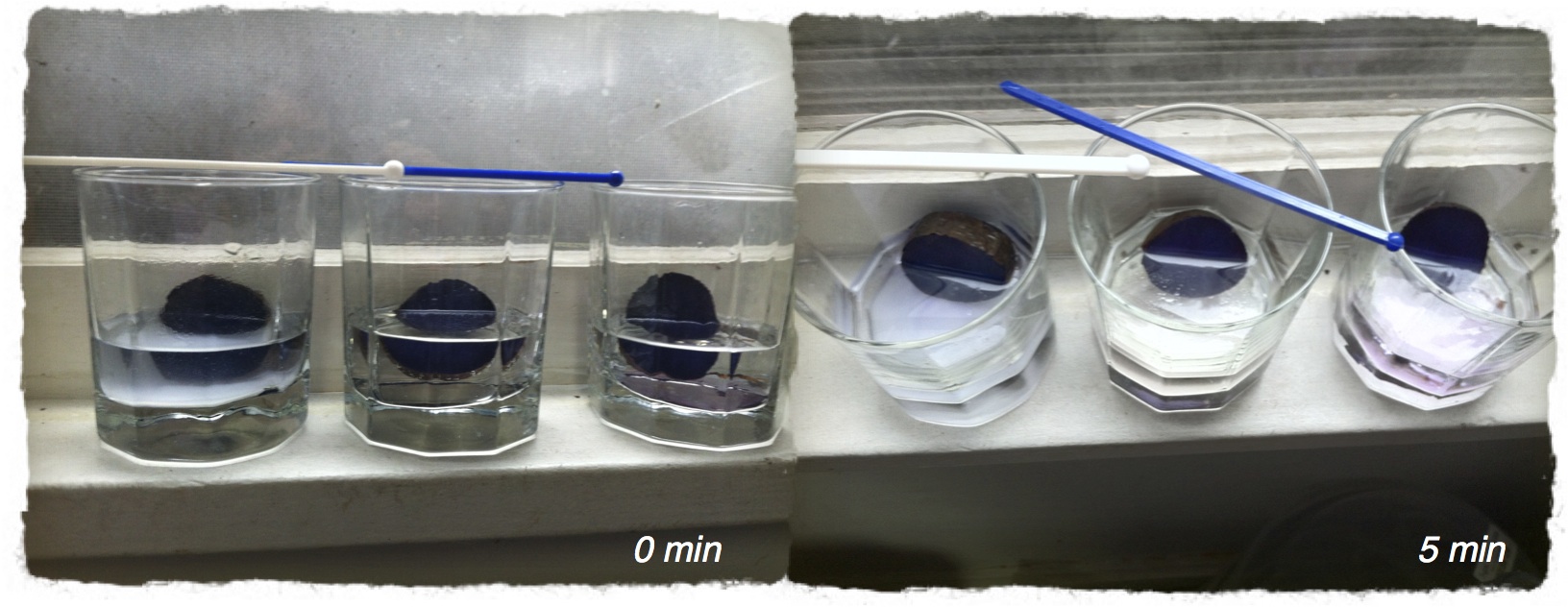 15 hours (the next morning): The color has spread and now occupies the full water column in each sample glass.