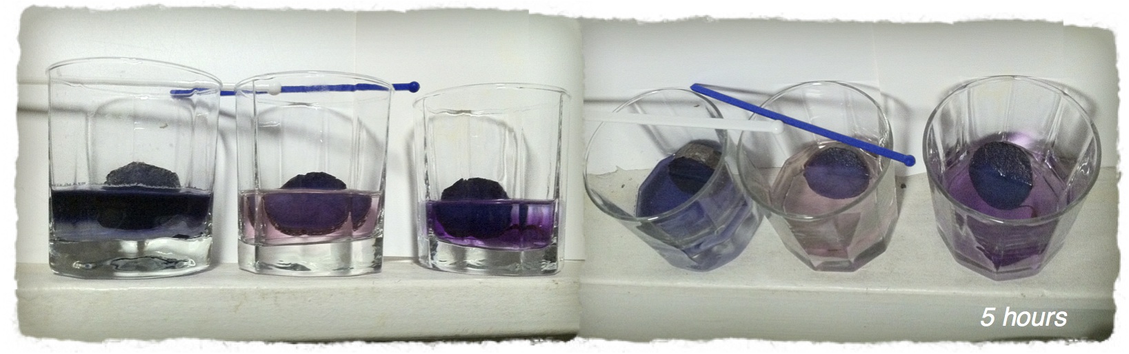 5 minutes: there is obvious leaching of color into tap water and baking soda solutions. The baking soda sample is decidedly bluer looking than the tap water sample, which is more purple. The acidic vinegar solution does not seem to be drawing out color at this stage.