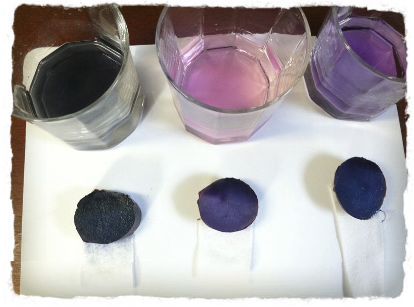 Do raw purple potatoes behave differently? Can you juice a purple potato to make a liquid indicator, or would you just get purple potato pulp? (sorry, apparently the attraction to alliteration wasn’t completely out!) Can you tweak the pH to modify the color of mashed purple potatoes?