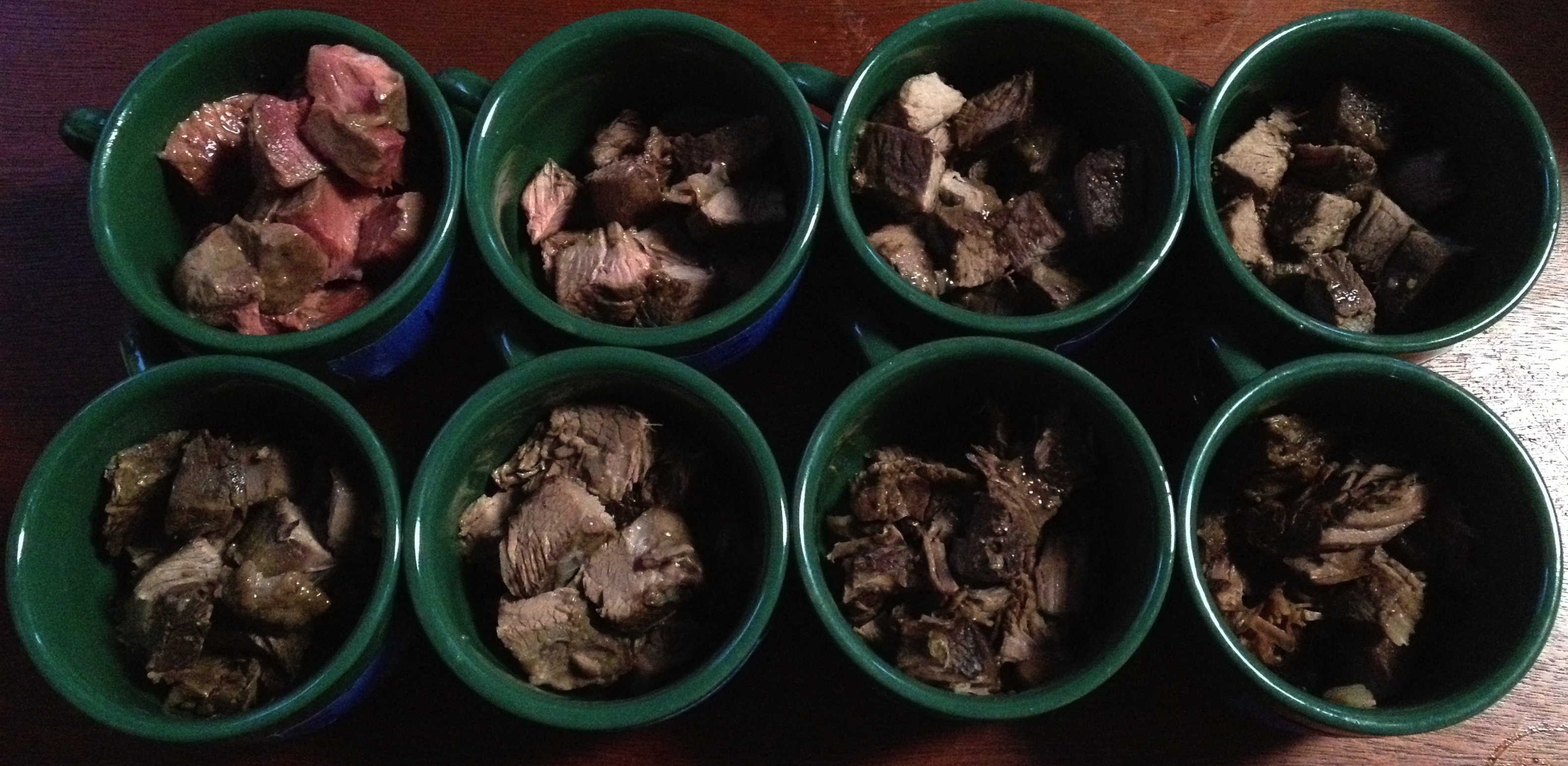 Meat cut up and ready for tasting. Top row left to right: 1 hour, 2 hours, 3 hours, 4 hours. Bottom row left to right: 5 hours, 6 hours, 7 hours.
