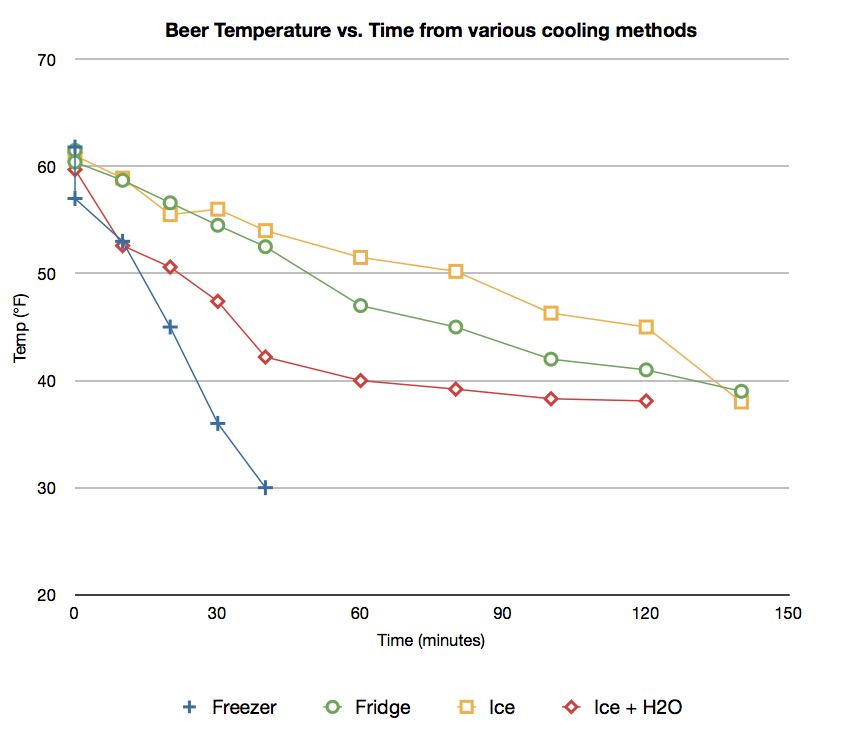 Placing beer in the freezer was the quickest method for chilling the beer. However, depending on your personal, beer temperature consumption threshold, ice+water could also be efficient if you needed to chill more beer than could be stashed in the freezer. If 40°F is acceptable, the ice+water technique reached that in an hour. However, an additional hour was required to drop it just another 2°F. This is because the ice-water the beer was sitting in was stable at 37°F for the last hour of cooling. Additional ice volume may make cooler-based beer chilling more competitive, and an added bonus is that you would not have to worry about beer slushies.
