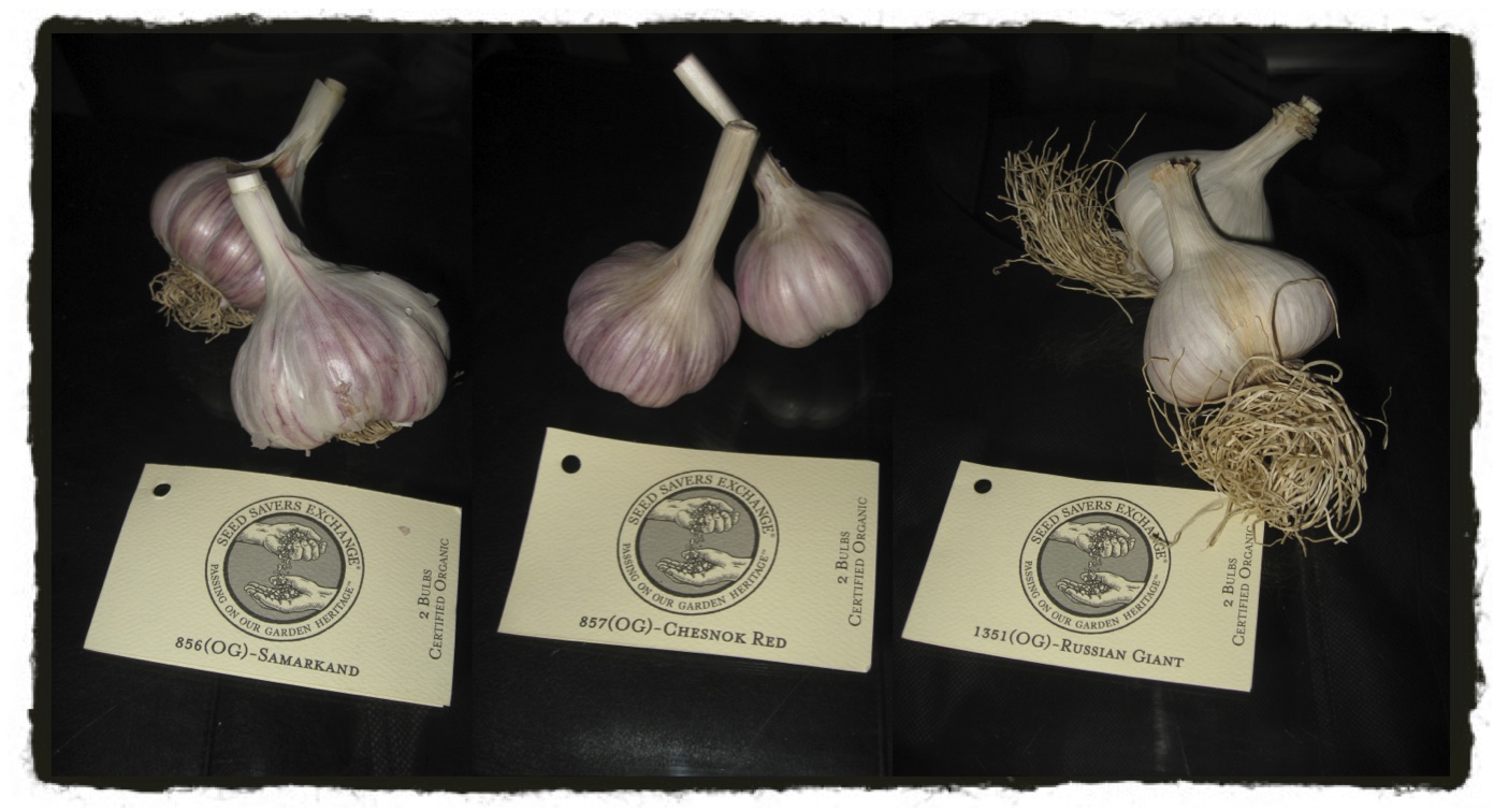 So, garlic was purchased and planted it out back where the tomatoes had previously been. Three varieties were chosen and purchased from SeedSavers, and for the challenge, 1 nice looking “California White” bulb was selected .