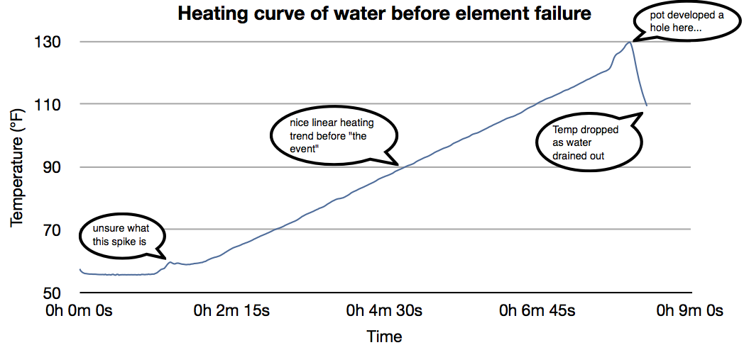 Due to this dramatic, and unplanned for failure, science was called to a halt for the day. The Biolite camping stove will be tested sometime in the future, and new heating curves for water on an electric stove  will have to be obtained at the Primary Testing Facility so we have data to compare against. Data collected during this attempt tells an interesting story, but will not be good for accurate comparisons: