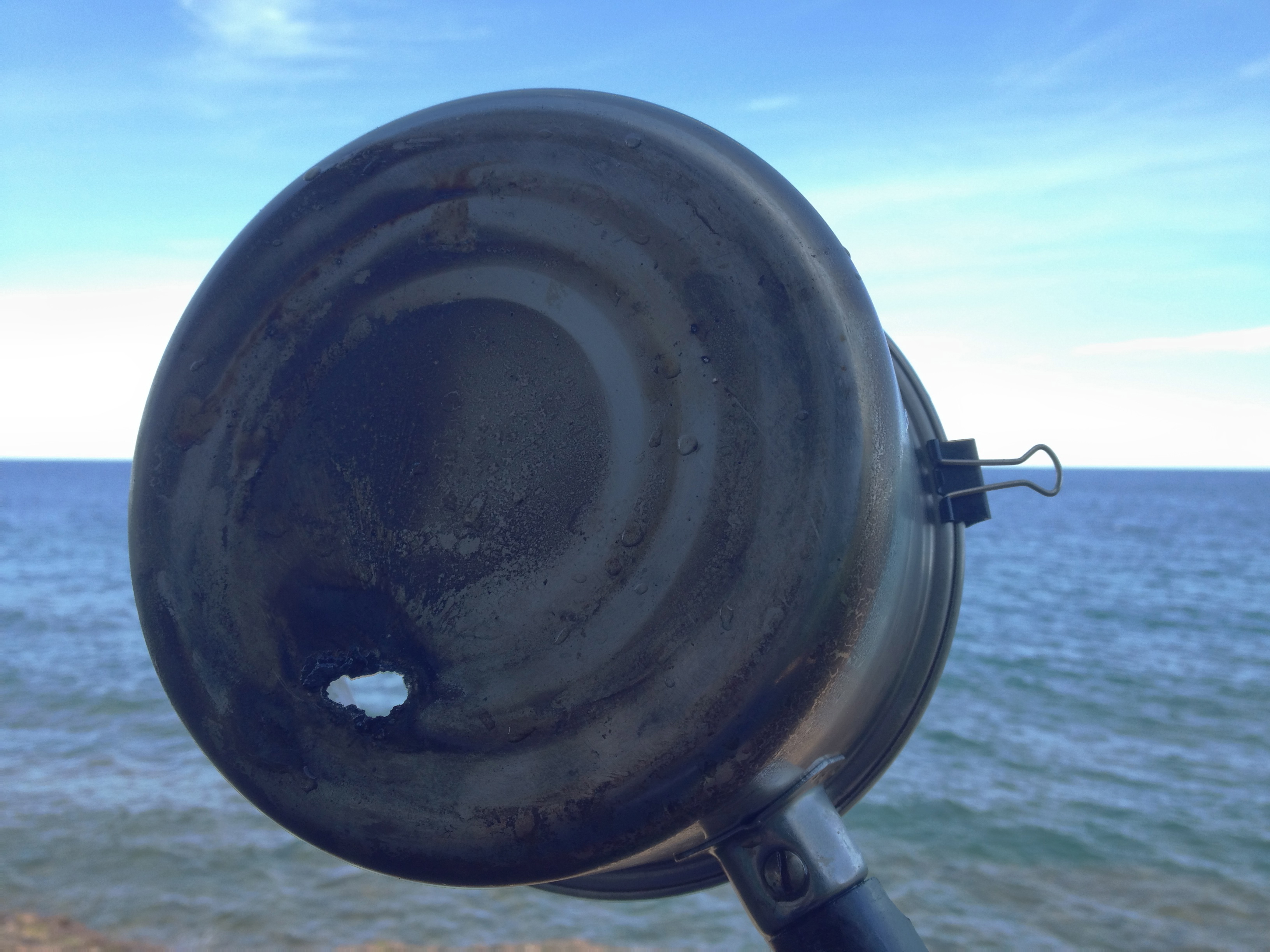 This pot has ceased to be a useful holder of fluids. The binder clip was used to hold the temperature probe off the bottom of the pan.