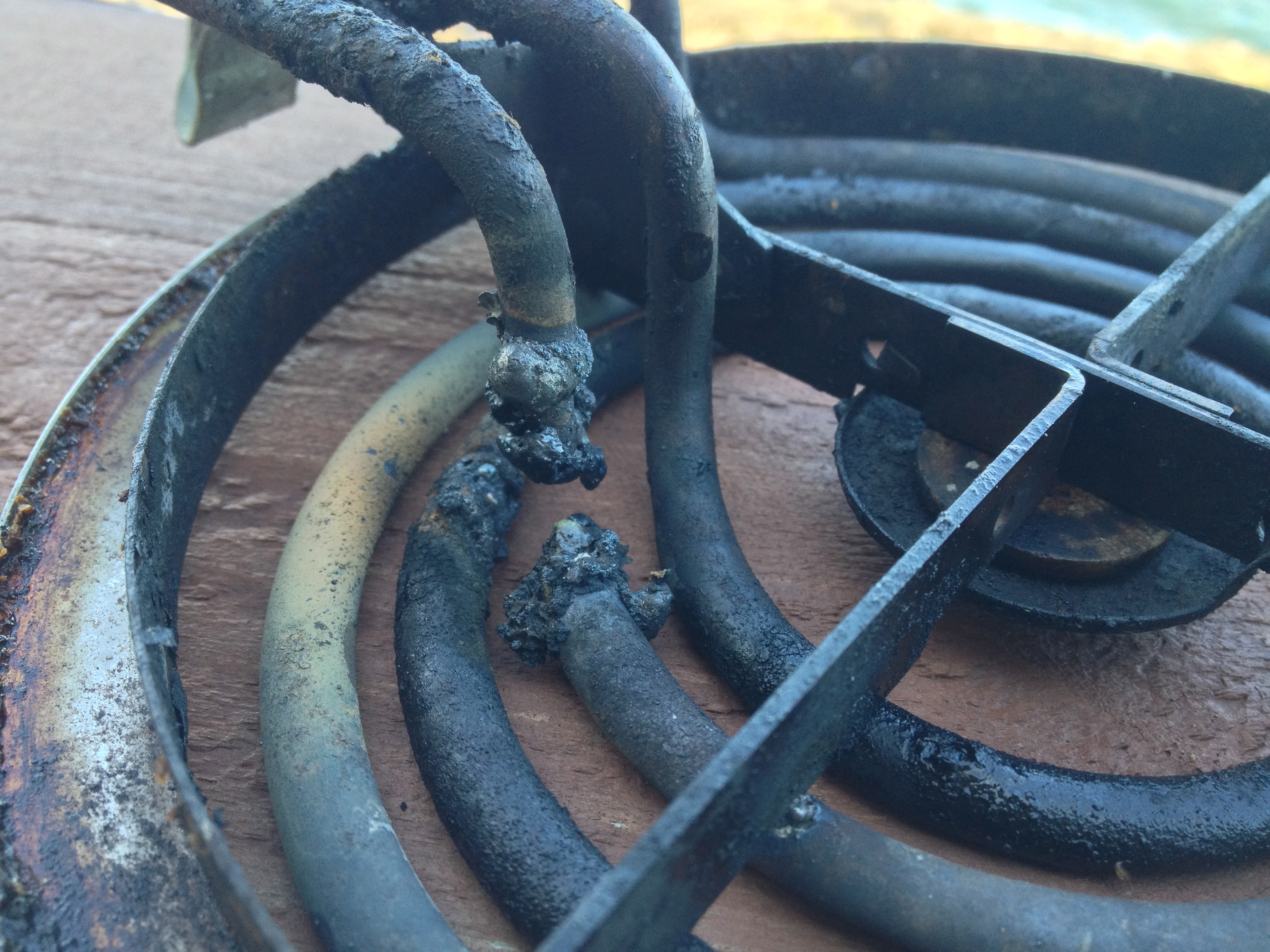 Needless to say, we quickly flipped the electrical main, followed that up with a quick trip to hit the shut-up-button on the smoke detector, and then made the rounds to open windows & doors to ventilate (this welding process, and resultant metal vaporization, produced some mighty-funky odors). As our liter of water had dribbled out of the pan, through the stove, and ended up in the under-stove storage bin and the floor, there was some additional water clean-up. Once the element was cool, it was removed from the stove and taken outside for inspection.