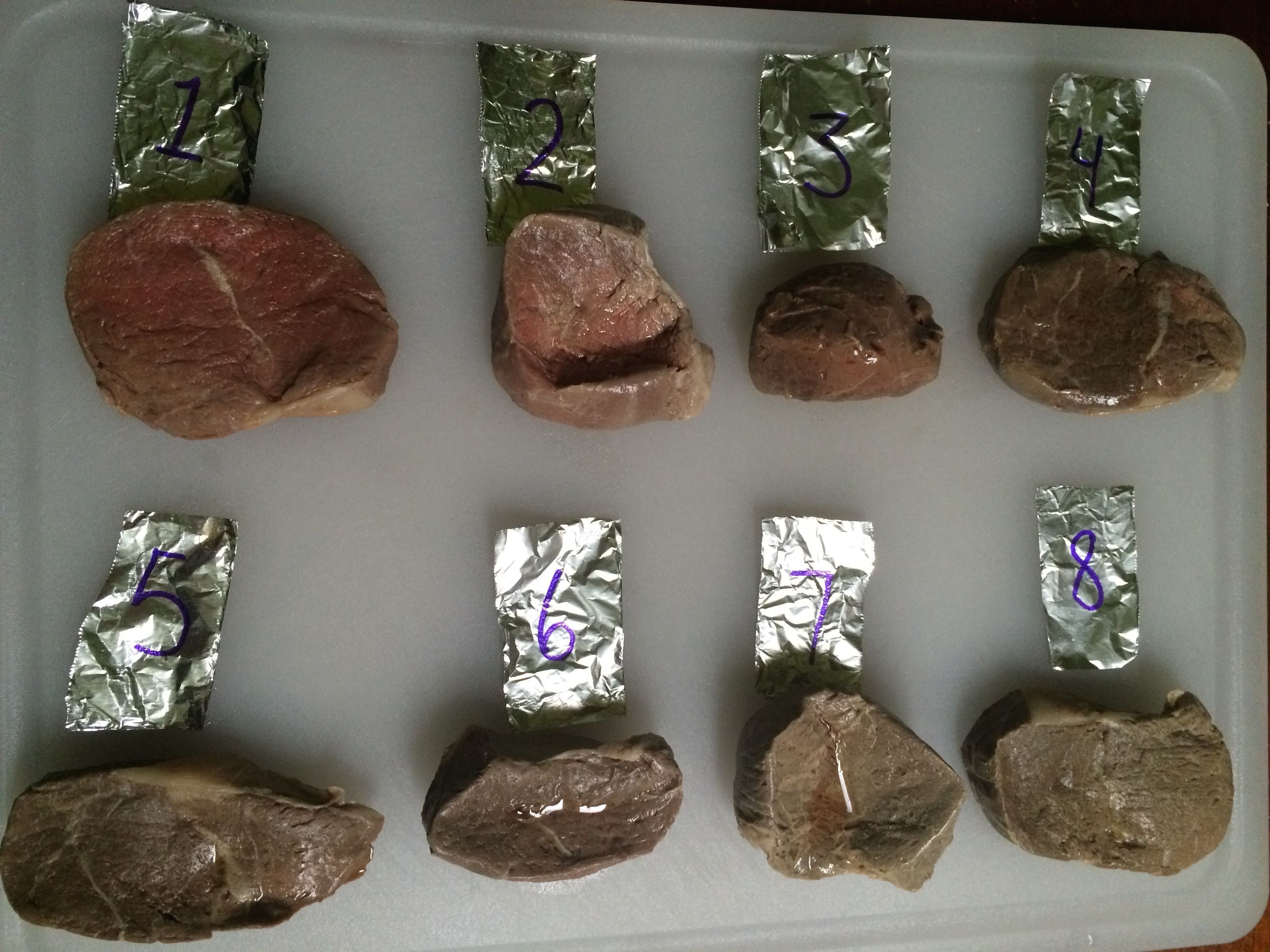 Chuck tender steaks post hot-tubbing. Numbers indicate how many hours they were in the bath. Steaks are un-salted, and un-seared.