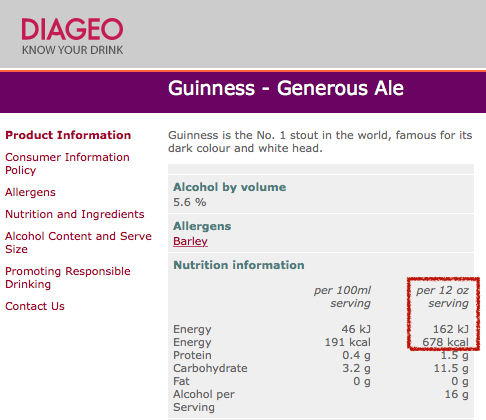 A news item popped up today about how alcohol conglomerate Diageo would be offering nutritional information. However, a little bit of cognitive dissonance set in after reading this sentence “And a 12 oz serving of Guinness — often referred to as a meal in a glass for good reason — clocks in at an eye-opening 678 calories.”