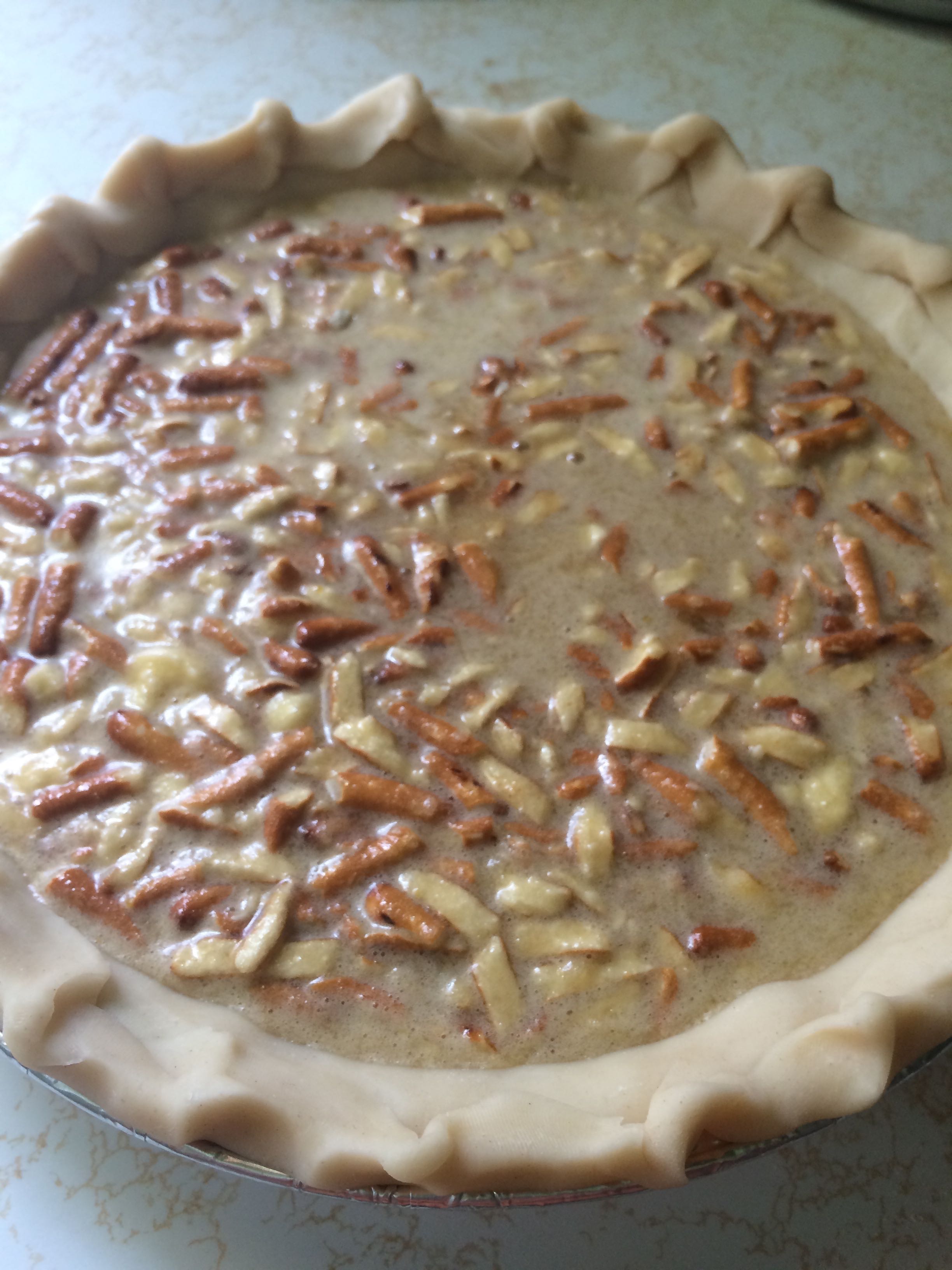 - due to tree nut allergies of one of our tiny taste testers, the pecans were replaced by 80g (~1 cup) of crushed pretzels per pie, which turned out to be pretty darned tasty.