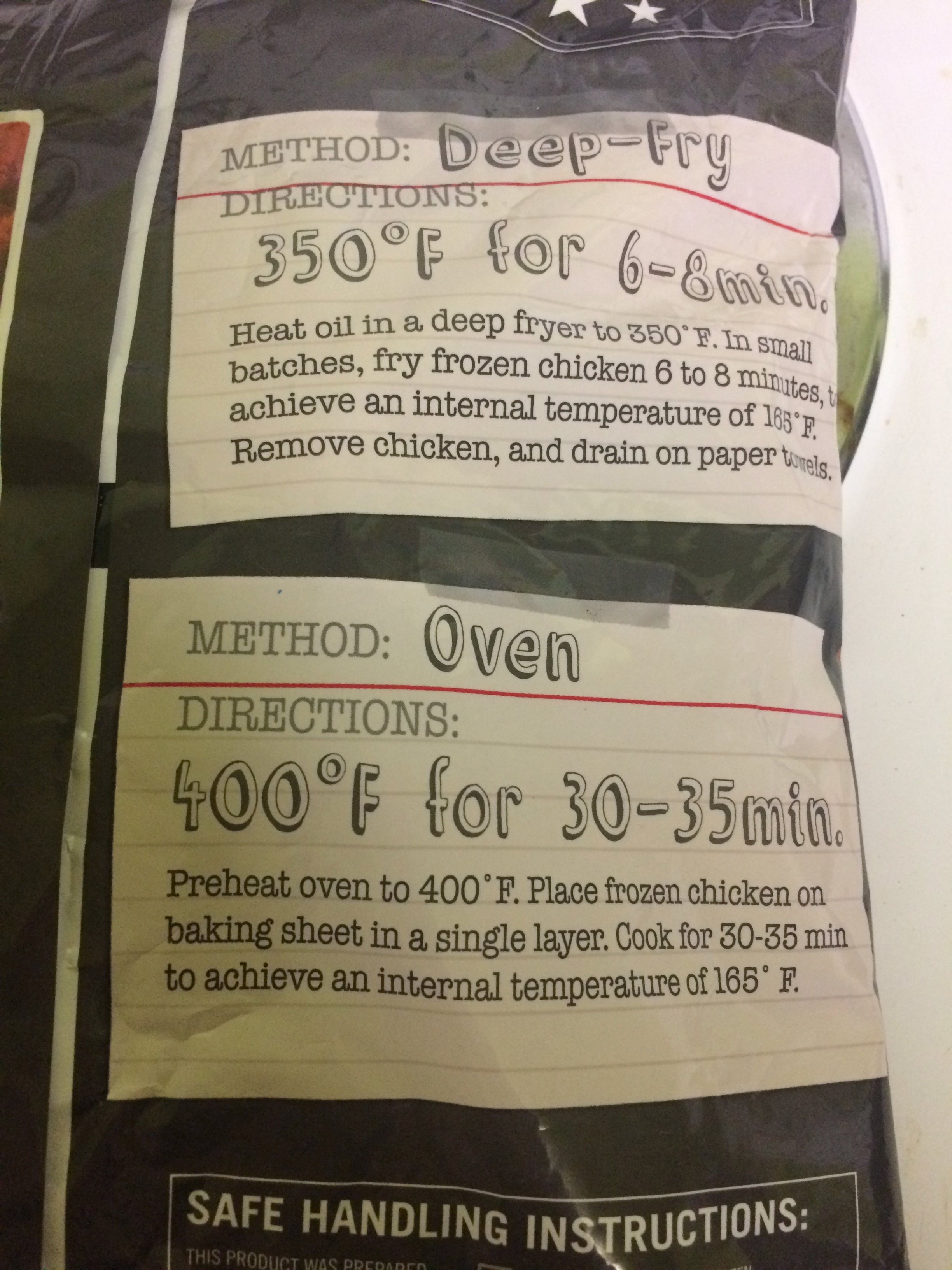 According to the package instructions, the target internal temperature for the chicken things was 165°F (for food safety). The minimum listed time was used (30 minutes for the oven, 6 minutes for the fryer) after which the internal temperature was checked with our trusty Thermapen. In both cases, the internal temperatures were between 205-210°F. While this obviously overshot the target (and perhaps meaning that cook times could be reduced), it did so by the same amount in both samples so impact on tasting should be minimal.