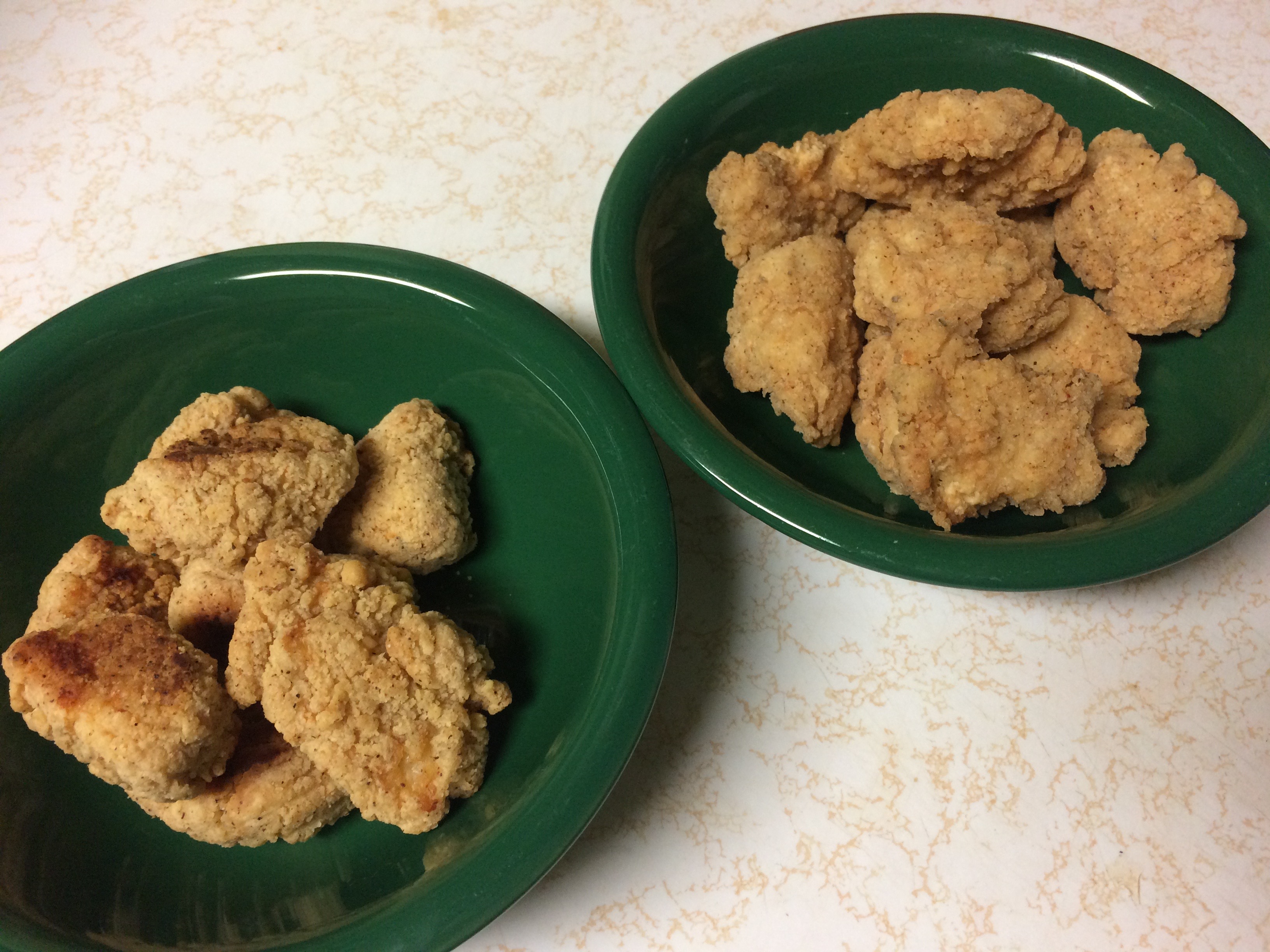 Both resident taste testers agreed that the fried chicken things were better. The texture was superior and there were no off flavors, which were presumed to be from the slight burning on one side of the oven-cooked samples.