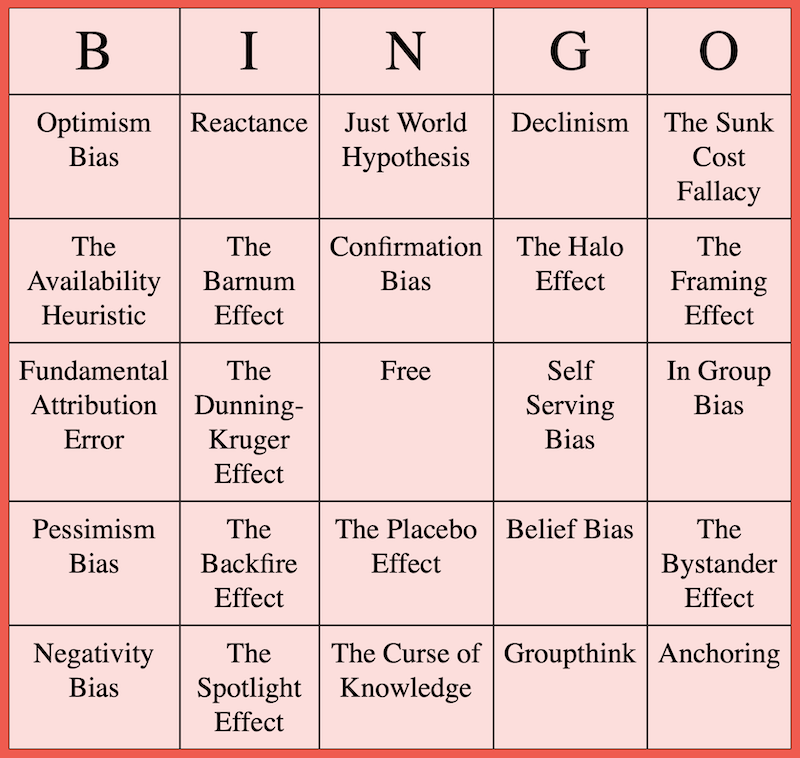 Example Board Published May 9, 2020 at 800 × 758 in Cognitive Bias Awareness Through Gamification Example cognitive bias bingo board. Get your randomized one at http://www.cognitive-bias-bingo.com/ .