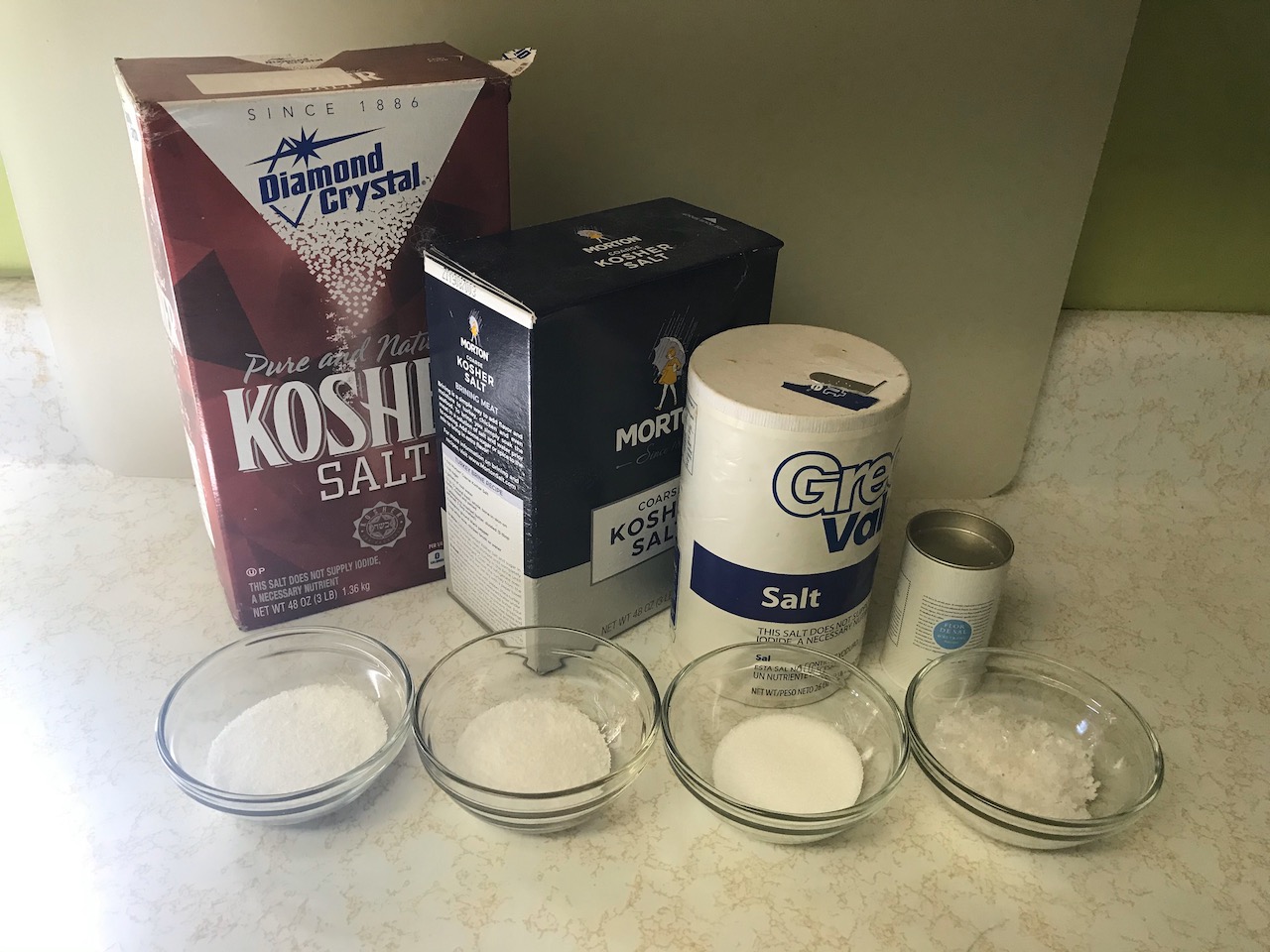 Perhaps not… Many recipes call for a specific amount of “kosher salt”, but we’ve noticed that sometimes it just felt (or later tasted) like the wrong amount to use. Through our introduction to kosher salt and other educational resources, it was clear that kosher salt and table salt are pretty different and we have been using kosher salt for our normal everyday cooking for years. However, as we really didn’t have any choices for kosher salt locally, we have been using Morton’s Coarse Kosher salt by default. We noted that occasionally Diamond Crystal Kosher salt was being recommended specifically, and it eventually dawned on us that there might be significant variation between brands of kosher salt that might be driving this observation.