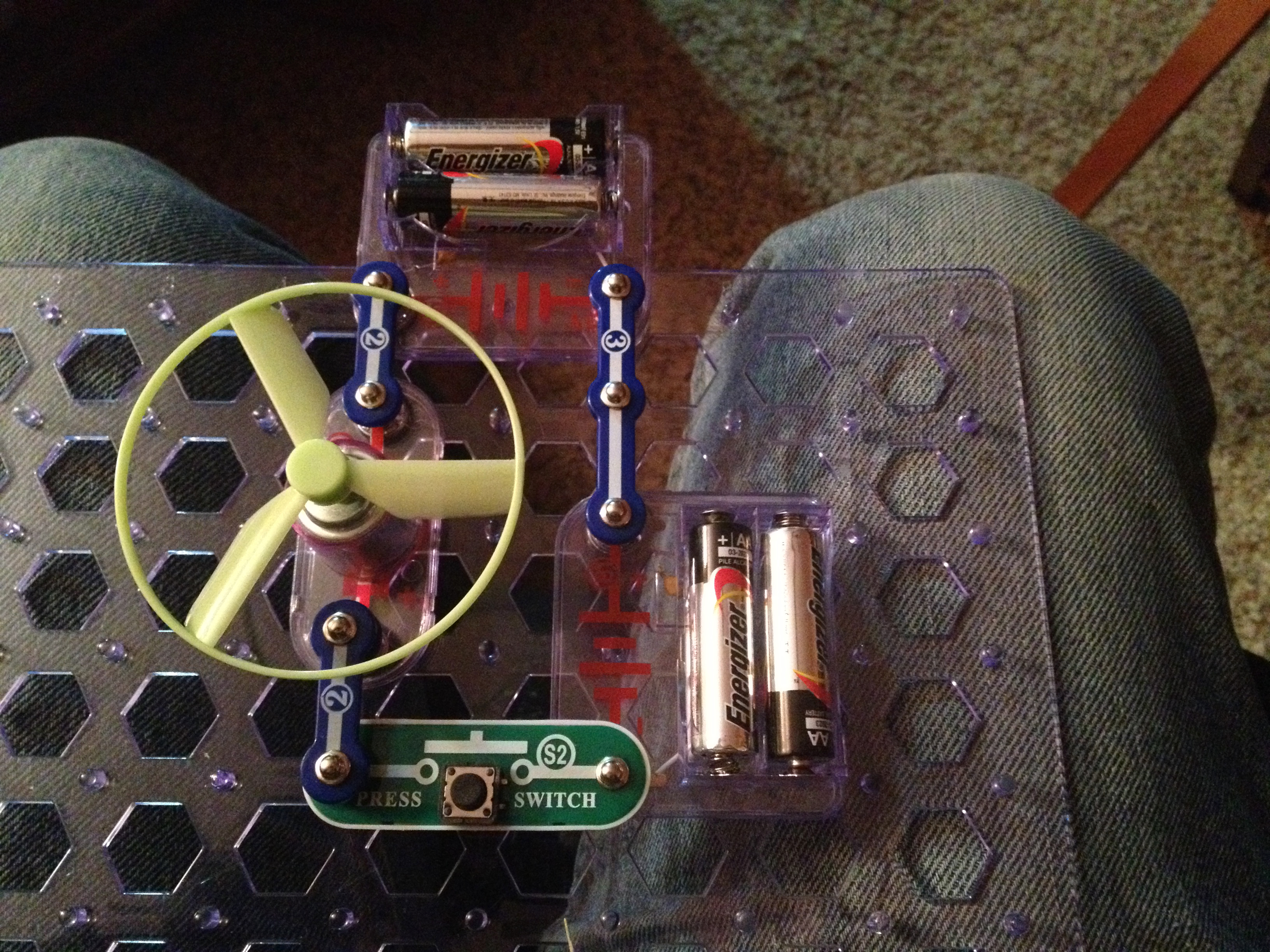While playing with a Snap Circuits kit over Spring Break 2013, one of our cats found the spinning fan blade very interesting.