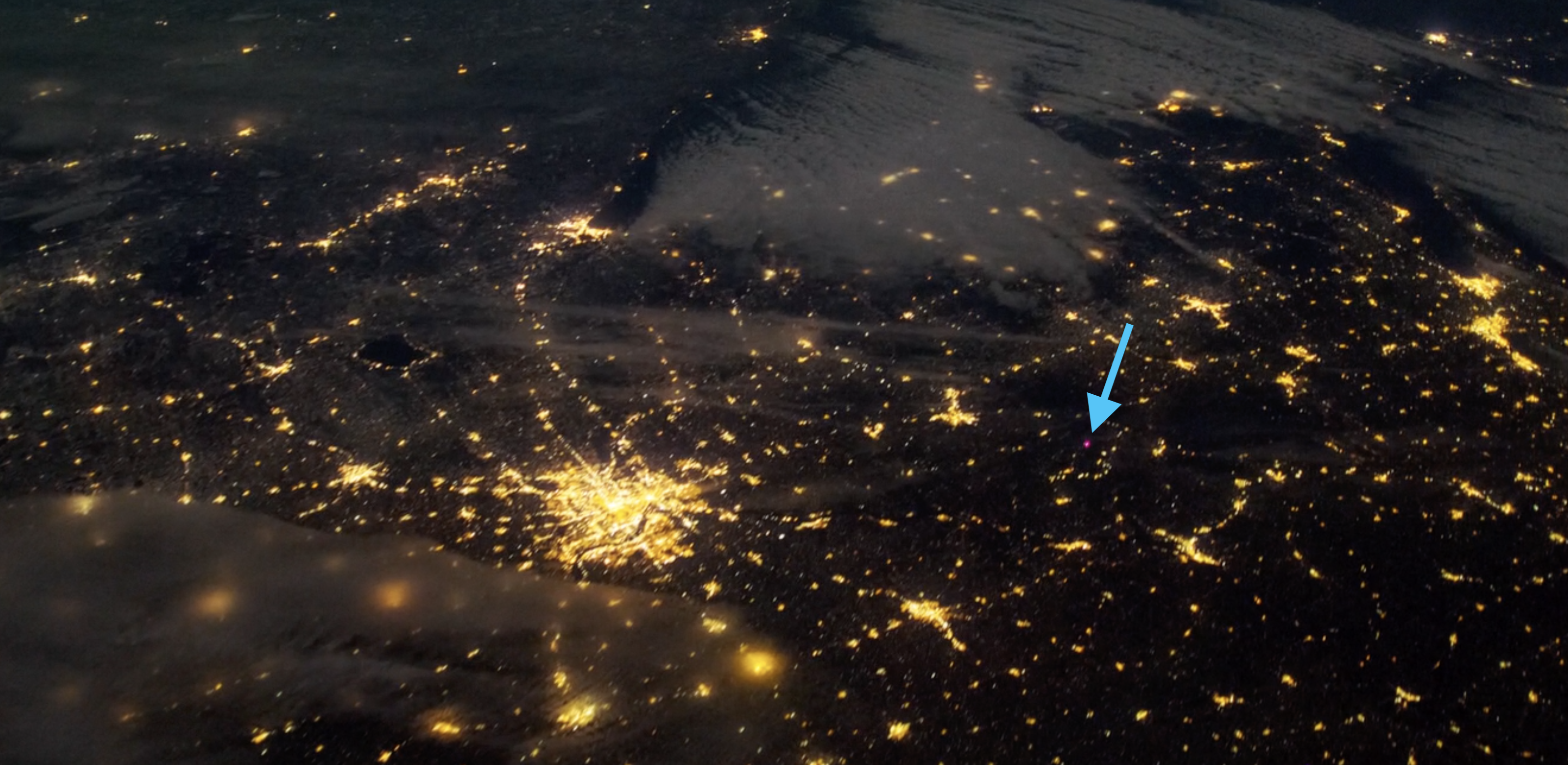 One of the Apple TV Aerial video screensavers, “North America Aurora”, shows a VERY purple dot somewhere in Wisconsin as part of a night image from space: