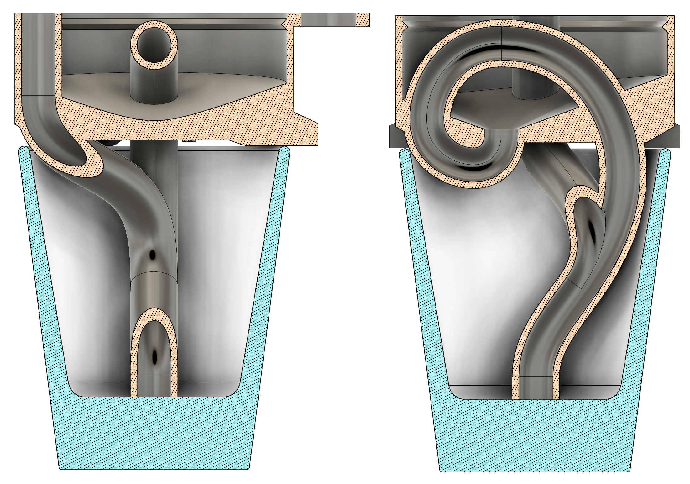 In addition to the main goals, I also wanted to make a few design changes, based on what had been learned from the Mk I. Among these are moving the vent pipe to the edge of the reservoir and increasing the siphon pipe diameter. Additionally, the intersection of the siphon and vent pipes is now tangential instead of perpendicular. Below are cross sections of the new Mk II siphon.